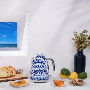 מטהרת הלבן ועד השלווה של הכחול, גווני הגלים הם גיבורי הקו החדש של מכשירי הבוטיק החשמליים הקטנים של  SMEG שבו וריאציות הצבע הלבן הללו פוגשות את החיות והעידון של הדפס מאיוליקה איטלקי מסורתי.