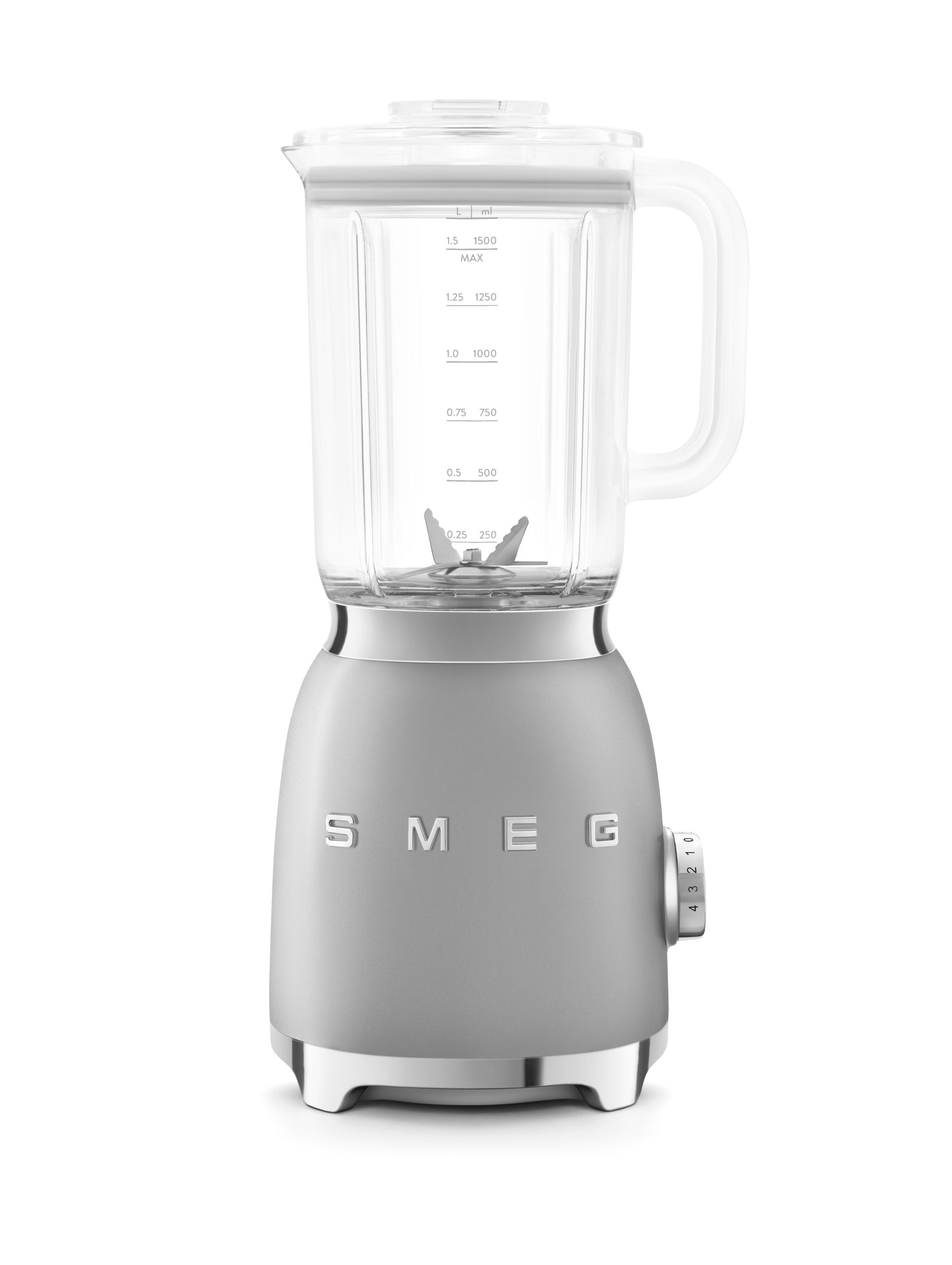 גוף בציפוי אלומיניום, כפתורי כרום. מיכל של 1.5 ליטר, BPA‐Free, מכסה שקוף וכוס מדידה