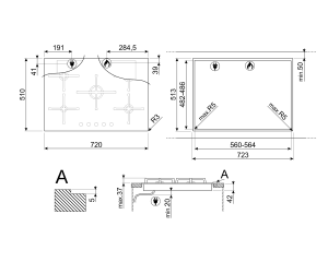 כיריים גז 5 מבערים, 72 ס”מ זכוכית שחורה מתצוגה